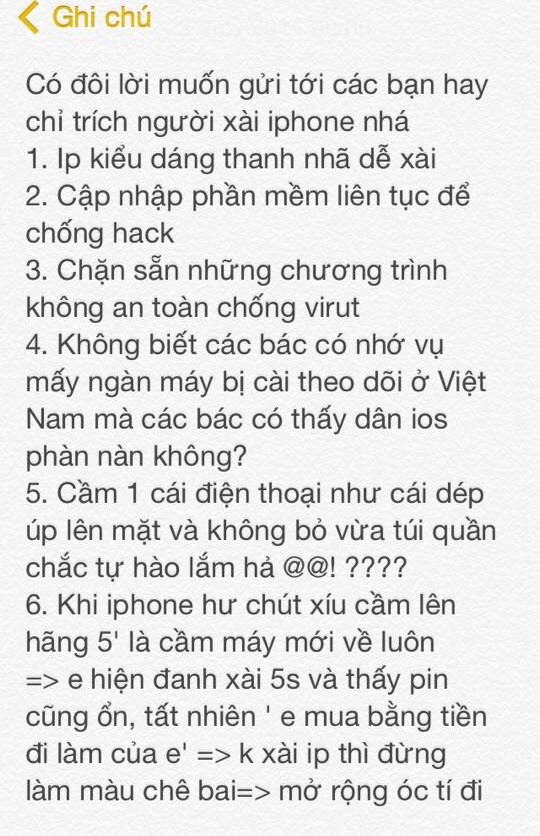 1. iPhone có kiểu dáng thanh nhă, dễ xài.2. Cập nhật phần mềm liên tục để chống hack.3. Chặn sẵn những chương tŕnh không an toàn, chống virus.4. Không biết các bác có nhớ vụ mấy ngàn máy bị cài theo dơi ở Việt Nam, mà các bác có thấy dân iOS phàn nàn không?5. Cầm điện thoại như 1 cái dép úp lên mặt và không bỏ vừa túi quần chắc tự hào lắm hả?6. Khi iPhone hư chút xíu, cầm lên hăng 5 phút là cầm máy mới về luôn.Em đang xài iPhone 5S và thấy pin cũng ổn. Tất nhiên, em mua bằng tiền đi làm của em. Không xài iPhone th́ đừng làm màu, chê bai, mở rộng óc tí đi.