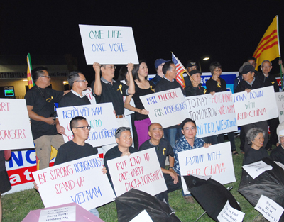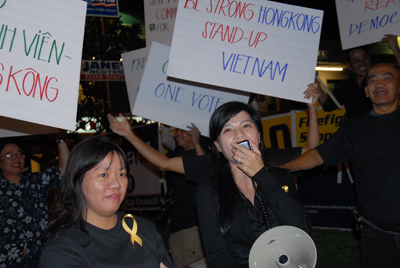 Gần 50 người, đa số là giới trẻ, mặc áo thun đen, trên áo có một chiếc nơ màu vàng. Một người cầm lá cờ vàng ba sọc đỏ, rất khí thế. Số người còn lại trên tay mang cờ Mỹ, Việt, hay các bảng biểu ngữ với hàng chữ “Down with Red China,” “Put an End to One-Party Dictatorship,” “Today Hong Kong-Tomorrow Vietnam,” “Free Election for Hong Kong.”