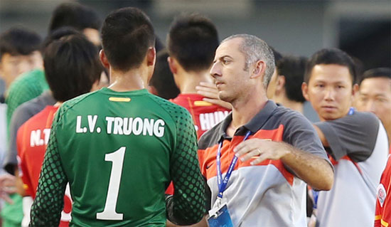 Thầy Giôm động viên các học tṛ sau thất bại. Ảnh: Kỳ Lân.