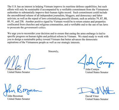 “Chúng tôi viết thư để bày tỏ sự quan tâm sâu xa của chúng tôi đối với quyết định của chính phủ nới lỏng lệnh cấm bán võ khí sát thương cho Việt Nam. Chúng tôi mạnh mẽ thúc giục tổng thống xét lại quyết định hoặc trì hoãn sự chuyển giao bất cứ dịch vụ hoặc thiết bị nào theo chính sách mới cho tới khi chính quyền Việt Nam cải thiện rõ rệt hồ sơ nhân quyền của họ,” bốn thượng nghị sĩ này, là các ông Marco Rubio (FLorida), John Cornyn (Texas), John Boozman (Arkansas) và David Vitter (Louisiana), mở đầu bức thư đề ngày 23 Tháng Mười gửi ông Obama như vậy.