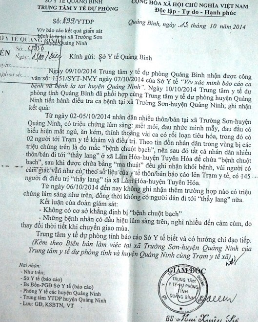Báo cáo về bệnh lạ ở xã Trường Sơn của Trung tâm y tế dự phòng tỉnh Quảng Bình.