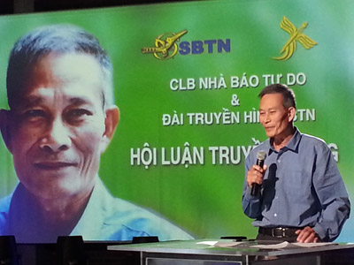 Nhà báo, blogger Điếu Cày Nguyễn Văn Hải tại buổi hội luận cùng đồng hương và giới truyền thông tại đài SBTN. (Hình: Ngọc Lan/Người Việt)