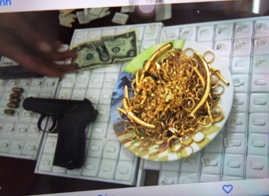 Số vàng các đối tượng cướp được và khẩu súng dùng để cướp tiệm vàng