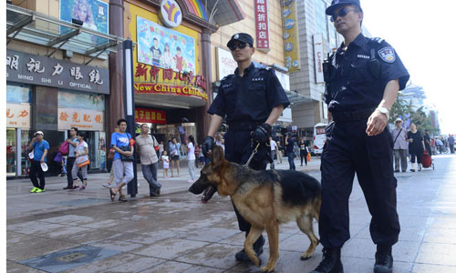 Cảnh sát đi tuần khu vực Vương Phủ Tỉnh, điểm du lịch nổi tiếng ở trung tâm Bắc Kinh nhằm bảo vệ an ninh trong thời gian diễn ra APEC. Ảnh: DFIC