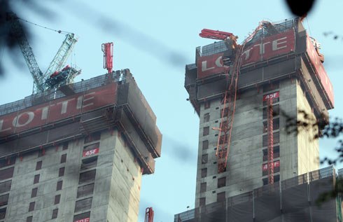 16h chiều 24.12.2012, đang cẩu 2 bó thép nặng, chiếc cẩu tháp đặt ở sàn tầng 50 công trình Trung tâm thương mại Lotte Hà Nội (gần khách sạn Daewoo), bỗng gãy gục, đổ xuống phía dưới. Làm việc với công an, chủ đầu tư cho biết, không có công nhân nào bị thương và nguyên nhân sự cố do bó thép va phải các ô kính phía dưới. Ảnh VNE.