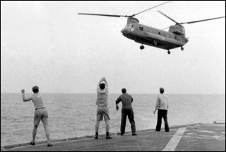 Trực thăng CH-47 lái bởi Thiếu tá Phi công Nguyễn Văn Ba bay xà trên USS Kirk