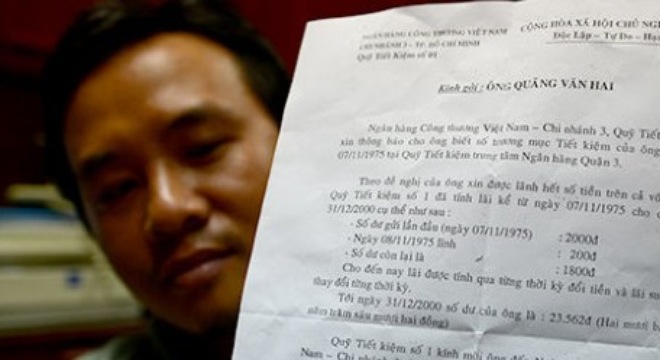 Kể câu chuyện của cha mình là ông Quãng Văn Hai, anh Quãng Hùng Minh (ngụ quận Bình Thạnh, TP.HCM) cho hay năm 2001, sau khi “gõ cửa” nhiều nơi, gia đình ông được hướng dẫn đến NH Công thương VN (VietinBank) chi nhánh 3, TP.HCM sẽ là đơn vị chi trả cho khoản tiết kiệm có số dư gửi là 1.800 đồng vào ngày 8-11-1975 do ba anh Minh đứng tên.