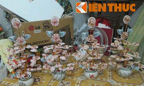 Cây trang trí bàn thờ Tết được làm bằng tiền giấy thật.