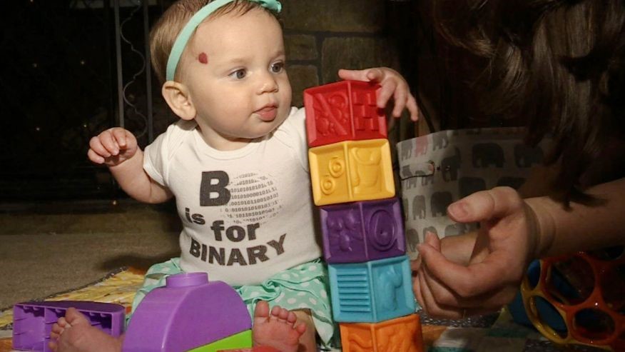 Trong hình ảnh 31 tháng một, năm 2014 này, Marilyn Mathews 6 tháng tuổi đang chơi với các khối ở Langhorne, Penn. Bé mặc một chiếc áo sơ mi mà đọc, B for Binary (nhị phân).