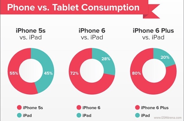 Một thống kê gần đây của ứng dụng đọc tin tức offline Pocket cho thấy chủ sở hữu iPhone 6 dành 72% thời gian của họ để xem nội dung trên chiếc điện thoại mới này trong khi chỉ dành 28% trên iPad. Con số này thậm chí còn tăng nhiều hơn trong trường hợp của người dùng iPhone 6 Plus khi người ta dành tới 80% thời gian cho chiếc phablet này thay vì 20% trên máy tính bảng cũng của Apple.