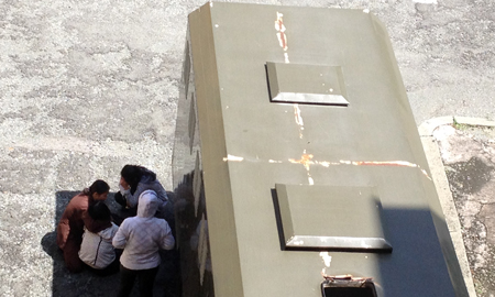 Gia đình bị cáo Sơn ngồi bệt bên chiếc xe tù