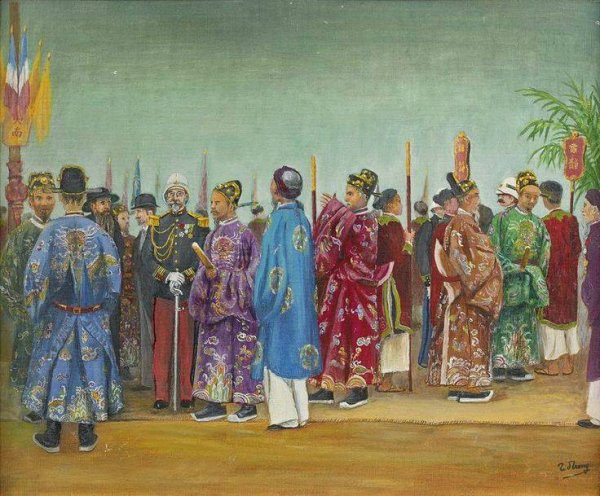 Tranh "Les Mandarins et les Autorites Françaises Attendant L’Arrivee de l’Empereur Thanh Thai" [7]