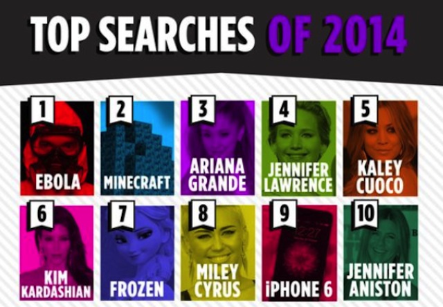 Yahoo vừa công bố danh sách mười yêu cầu tìm kiếm hàng đầu trong năm 2014. Không ngạc nhiên, virus Ebola có tên trên đầu trang vì những tin đồn về sự lan truyền của nó. Trong khi đó, Apple iPhone 6 cũng may mắn nằm ở vị trí thứ 9.