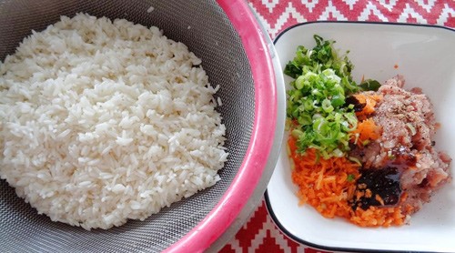 Bước 5: Sau đó cho viên thịt bọc gạo nếp này lên khoanh cà rốt, rồi xếp lên xửng.