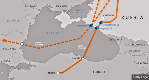 Vào lúc Tổng thống Putin tuyên bố ngừng “Dòng chảy phương Nam” trong dịp thăm Ankara, Nga và Thổ Nhĩ Kỳ đã ký thỏa thuận xây dựng một tuyến đường ống ngầm dưới Biển Đen nối liền Nga và Thổ Nhĩ Kỳ để có thể vận chuyển khí đốt với mức giá giảm 6%. Thổ Nhĩ Kỳ là khách hàng lớn thứ hai của Gazprom sau Đức tiêu thụ khí đốt của Nga. Đổi lại, Nga sẽ nhận được hợp đồng xây dựng thêm một nhà máy điện hạt nhân tại Thổ Nhĩ Kỳ.