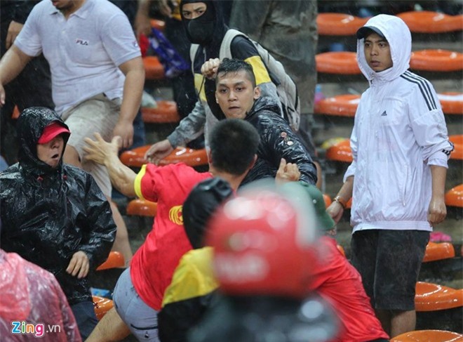 Lúc này cơn mưa vật cứng lại tiếp tục chĩa về phía CĐV áo đỏ và một người Việt không may bị mảnh thuỷ tinh rơi trúng đầu dẫn đến chảy máu. CĐV có mặt trên khán đài chạy tán loạn để tránh xa khu vực CĐV Malaysia vì hoảng sợ.