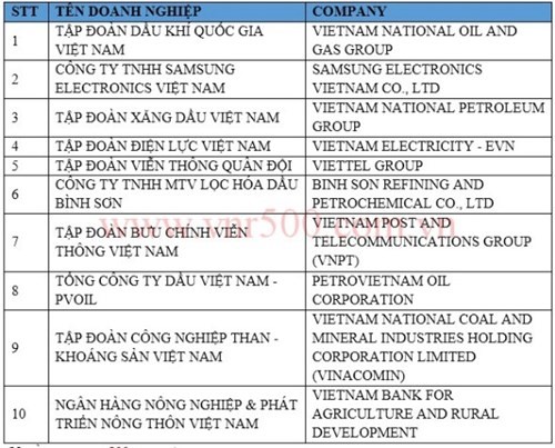 Top 10 doanh nghiệp dẫn đầu bảng xếp hạng 500 doanh nghiệp lớn nhất Việt Nam.