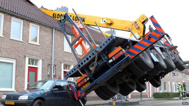 Tuy nhiên, chiếc cần cẩu không giữ được thăng bằng và đổ lật vào một gia đình hàng xóm bạn gái.