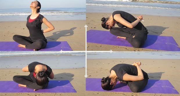Ngồi bắt chéo chân bình thường, dùng tay trái nắm lấy cổ tay phải vòng ra sau. Hít vào kéo vai ra sau và mở rộng ngực.Giữ cổ tay trái của bạn với bàn tay phải của bạn ở phía sau.