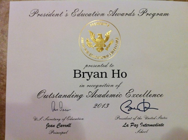 Vương Bảo nhận được nhiều bằng khen cho thành tích học tập xuất sắc, trong đó có giấy khen của Tổng thống Mỹ.