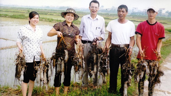 Trong ngôi là ven đô, Trần Quang Thiều và nhóm của ông hoạt động liên tục nhằm diệt chuột trên những cánh đồng lúa. Họ ước tính có tới 20% lượng ngũ cốc của nông dân bị loài gặm nhấm này phá hoại hàng năm. Chúng gây ảnh hưởng trực tiếp tới nền kinh tế của Việt Nam, quốc gia xuất khẩu gạo hàng đầu thế giới, phóng sự của AFP viết. Ảnh: AFP
