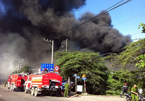 Hơn chục xe cứu hỏa huyện Bình Chánh và các khu vực khác của TP HCM đang cật lực phun nước vào đám cháy, song khói đen và lửa vẫn ngùn ngụt bốc lên. Cách xa hàng km, nhiều người vẫn nhìn thấy.