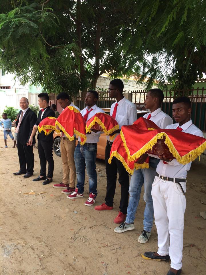 Bạn gái người Hà Tĩnh , yêu và đính hôn với anh này người Hà Nội và cả 2 cùng đang làm việc tại Angola nhé Trong khi đó , tại Việt Nam nhà của 2 bạn ý cũng làm lễ ăn hỏi như bình thường chỉ không có mặt 2 bạn ý thôi, nhưng không khí vô cùng vui tươi và đầm ấm . Về lễ ăn hỏi đặc biệt ở Angola, chú rể chia sẻ: "Hôm nay rất mệt mà cũng vui. Ăn hỏi là máu chốt quan trọng đối với vợ chồng. Trời đẹp, không nắng không mưa lại thoải mái đứng ngoài trời hít khí trời vì mấy hôm qua chết trú ở trong nhà". tm