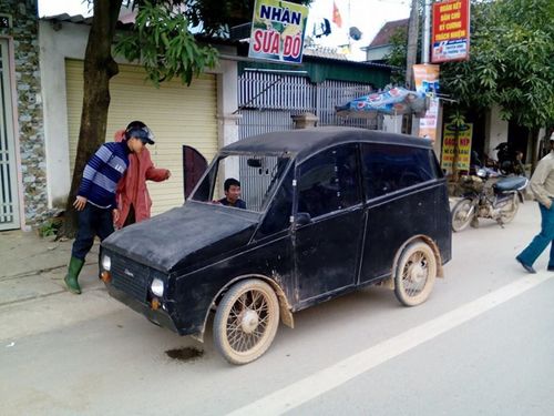 Chiếc ôtô này được làm ra từ động cơ và bánh xe máy. "Vì nhà nghèo, nếu có tiền mua thì tôi chế tạo làm gì"- chủ xe nói.