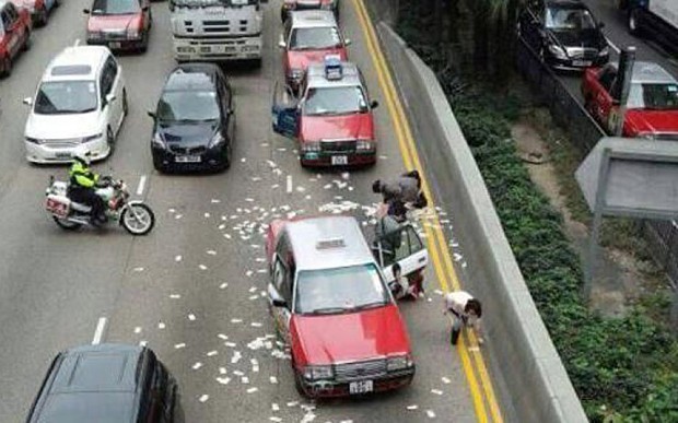 Người dân nhặt tiền bất chấp giao thông đông đúc. Ảnh: Telegraph