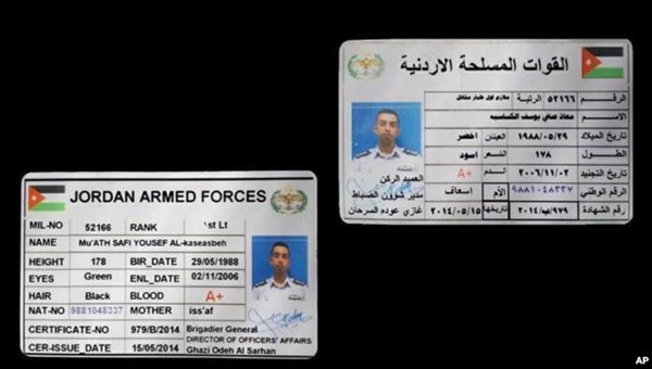 Tờ Bloomberg đã tiết lộ danh tính của viên phi công này là Moath al-Kasassbeh, 27 tuổi, thiếu úy trong Không lực Hoàng gia Jordan. Theo người thân của Kasassbeh, chỉ một tuần trước khi bị bắn rơi, anh này đã gạt bỏ những quan ngại của gia đình về việc anh tham gia chiến dịch không kích chống IS và nói: “Đừng lo cho con”.