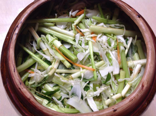 Cho tất cả rau và nước vào một âu sành hoặc sứ. Lấy cái đĩa đặt lên mặt dưa đảm bảo dưa ngập trong nước. Không nên muối dưa trong lọ nhựa vì nhựa có thể phản ứng với axit trong nước dưa, không tốt cho sức khỏe.