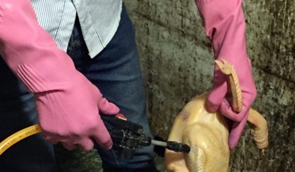 Những con gia cầm đáng thương bị các lái buôn tống thẳng từng mớ tạp chất vào cổ họng, hay bơm nước cống nhằm tăng trọng lượng trước khi bán.