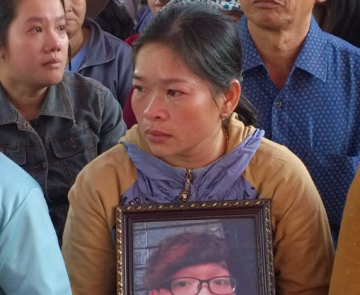 Mẹ nạn nhân Bảo ôm di ảnh con trai và mắt nhòe lệ.