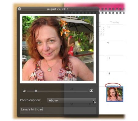 Tiếp theo, bạn có thể thêm ảnh vào các ô vuông ngày bằng cách kéo hình ảnh thu nhỏ của bảng hình ảnh vào chính ngày đó. Nhấp đôi vào ảnh trên lịch và sử dụng thanh trượt dẫn đến bảng điều khiển để phóng to hình ảnh trong hình vuông, sau đó kéo đến vị trí khác. Để thêm một chú thích, bạn có thể chọn một vị trí từ menu Photo caption của bảng điều khiển và nhập văn bản. Những hình ảnh hiển thị nếu tràn đầy hình vuông sẽ ẩn ngày chú thích riêng, thay vào đó nó sẽ được đặt ở vị trí trên, dưới, hoặc bên trái/phải của hình ảnh.