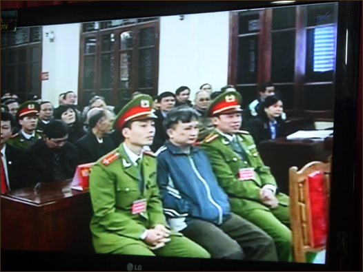 Ông Trần Anh Kim tại phiên xử kín tại tòa án Thái Bình hôm 28-12-2009. Hình chụp qua màn hình tivi đặt cạnh phòng xử án.AFP PHOTO
