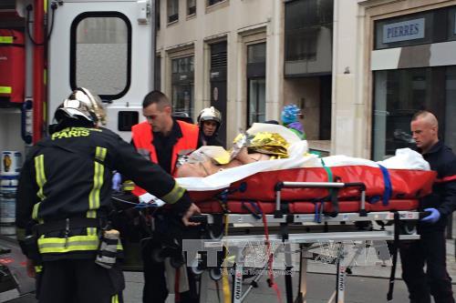 Cảnh sát Pháp chuyển một nạn nhân bị thương trong vụ tấn công ṭa soạn báo ở Paris làm 12 người chết. Ảnh: AFP- TTXVN.