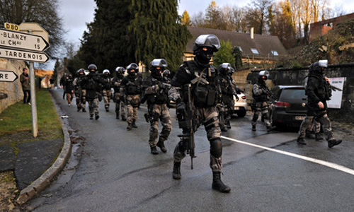 Một lượng lớn cảnh sát được trang bị vũ khí hạng nặng đang tập trung rà soát ở vùng nông thôn và rừng rậm ở khu vực. Họ chặn một con đường dẫn tới ngôi làng Longpont, cách trạm xăng, nơi được cho là điểm dừng cuối cùng của hai tên, khoảng 10 km. Các điều tra viên dùng trực thăng và các công cụ phát hiện trong bóng đêm để lùng sục, quyết tâm truy bắt hai kẻ cực đoan.