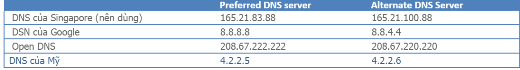 Tại đây, người dùng có thể điền địa chỉ DNS mới vào hai ô trống và bấm OK/ Apply để hoàn tất. Danh sách những DNS khuyến khích sử dụng được liệt kê trong bảng sau. Thử nghiệm với DNS của Singapore (165.21.83.88/ 165.21.100.88), tốc độ tải trang web quốc tế tăng đáng kể so với trước.