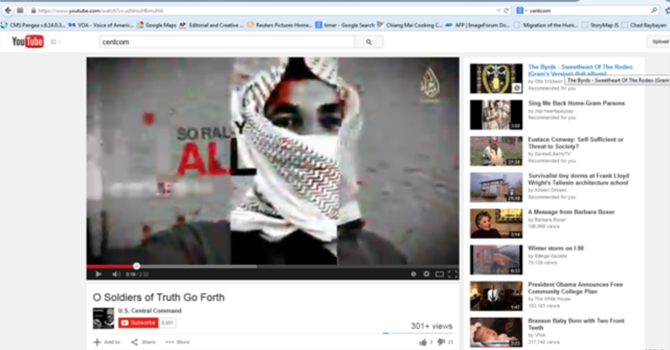 Tin tặc, tuyên bố là những kẻ trung thành với nhóm Nhà nước Hồi giáo, chiếm tài khoản YouTube của CENTCOM trong một khoản thời gian ngắn, 12/1/15.