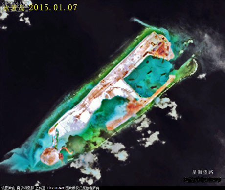 Các bức ảnh vệ tinh được chụp hồi tháng 11 năm ngoái cho thấy dự án cải tạo đất tại băi đá Chữ Thập, bắt đầu từ tháng 8 năm ngoái, đă tạo nên đảo nhân tạo có thể phục vụ một đường băng dài 3 km.