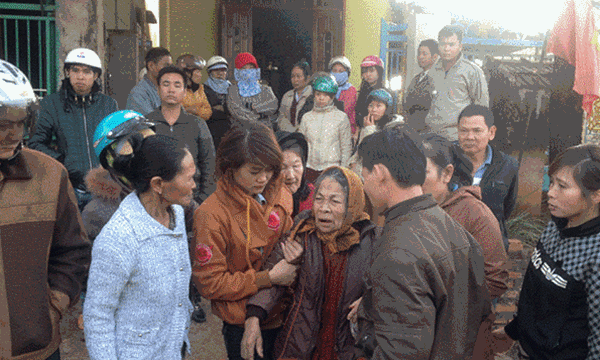 Bà Lưu Thị Hồ (quấn khăn) bàng hoàng trước cái chết của con cháu. Ảnh GLO