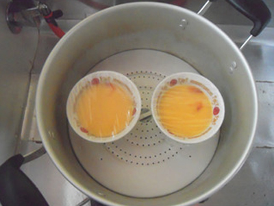 - Đem trứng đi hấp trong khoảng 12' - 15' tùy vào độ to nhỏ của bát trứng.