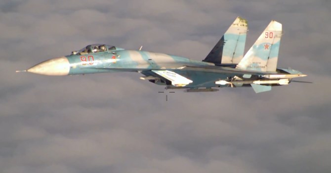 Đoạn clip quay lại cảnh một chiếc máy bay Su-27 vũ trang đầy đủ của Nga áp sát chiếc máy bay tuần tra từ phía mạn phải, giữ khoảng cách an toàn, dùng bộ thắng hơi để giảm tốc, sau đó bẻ lái sang hướng khác.