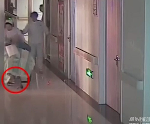 Nhưng một người thân nói với anh Pan rằng cô này đã chứng kiến em bé bị ngã, lộn ngược đầu và kéo lê trên hành lang bệnh viên mà y tá không hề hay biết. Quá phẫn nộ, anh Pan yêu cầu bệnh viện được cho xem lại camera giám sát. Hình ảnh từ camera cho thấy một phần đầu của con anh Pan chạm hẳn xuống nền sàn lạnh, dây rốn kéo loằng ngoằng phía sau xe đẩy và tình trạng em bé mới chào đời bị treo lơ lửng này diễn ra suốt hơn 10 mét hành lang mà không ai hay biết.