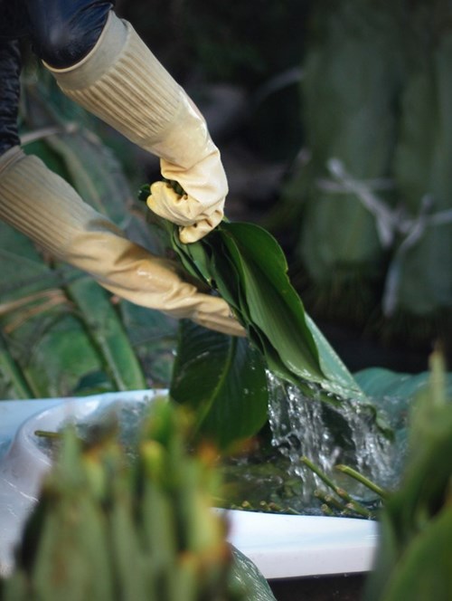 Lá dong khi mới mang về sẽ được nhúng nước cho tươi.