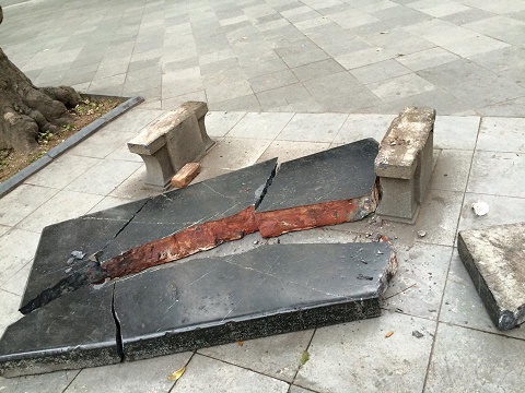 Sáng hôm nay nhiều người dân Hà Nội bàng hoàng khi phát hiện chiếc ghế đá cố thời Lê cạnh hồ Gươm bị bế nát không còn nguyên vẹn.