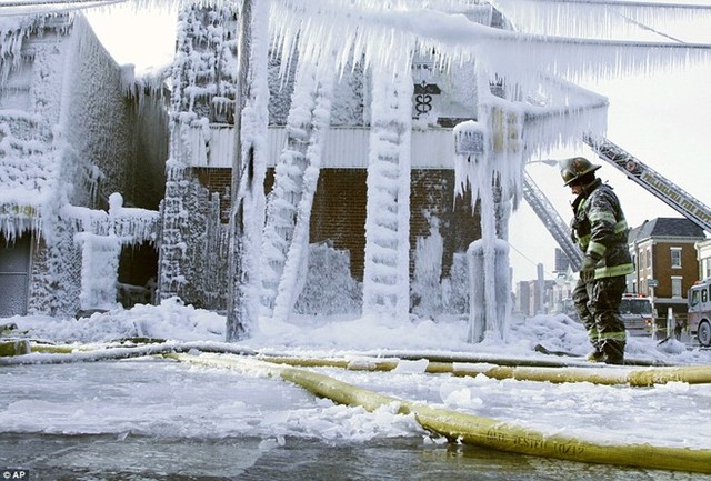Một vụ hỏa hoạn tại Trung tâm Y tế Locust, thành phố Philadelphia vào tối 20/2 khiến nhân viên cứu hỏa phải phun nước để dập lửa. Nhưng vào sáng 21/2, nước tạo thành khối băng phủ kín tòa nhà. Ảnh: AP