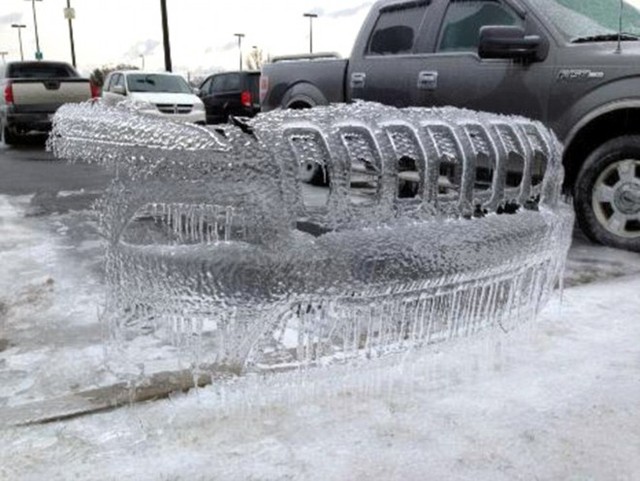 Băng bao phủ thanh chắn va đập của một ô tô trong bãi đỗ xe tại thành phố Greenville, bang South Carolina, Mỹ vào ngày 20/2. Sau khi xe rời khỏi bãi, khối băng vẫn giữ nguyên vị trí. Ảnh: Daily Mail