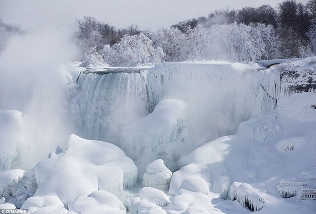 Nước của thác Niagara lừng danh đóng băng khi đang chảy, tạo nên cảnh tượng siêu thực. Những cây gần thác cũng "hóa đá". Ảnh: REX