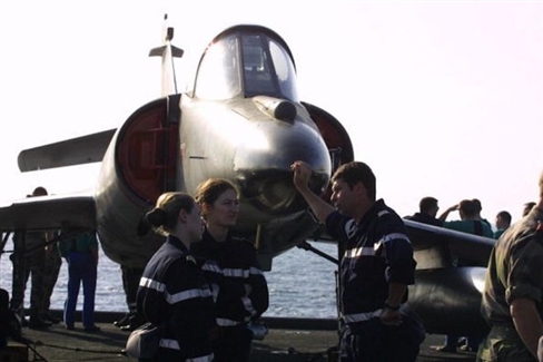 Trong 6 tháng sau đó, tàu đóng vai trò hỗ trợ cho hoạt động do Mỹ dẫn đầu tại Afghanistan. Thuyền viên Pháp (ảnh trên) nói chuyện trước chiến đấu cơ Super Etendard trên tàu sân bay ở biển Arab, cách Afghanistan khoảng 2.500 km vào tháng 2/2002. Trước khi Charles de Gaulle lần đầu tiên được triển khai, hải quân Pháp quyết định thiết lập một hạn ngạch, đảm bảo có nữ quân nhân trong thủy thủ đoàn. Ảnh: AFP